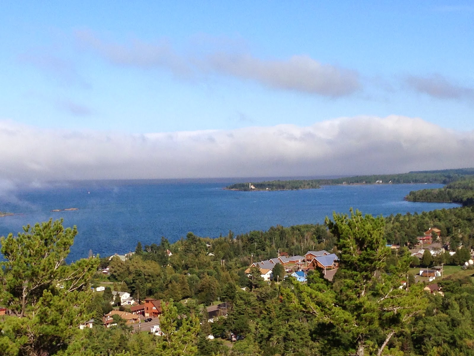 Taking advantage of the beautiful day, we drove up Brockway Mountain, “paved in potholes”, we’d been warned. Standing 1300 feet above sea level, from the heavens to the earth, it was a visual buffet, and can’t be captured by pictures. To our left was the vast expanse of Lake Superior with small islands serving as natural breakwaters, shrouded in wisps of fog; in front and to the right, greens of every hue sprinkled with flecks of gold and orange, broken up by inland lakes. The small village of Copper Harbor hugs the shoreline. The scene was every bit as beautiful as anything I’ve ever seen.