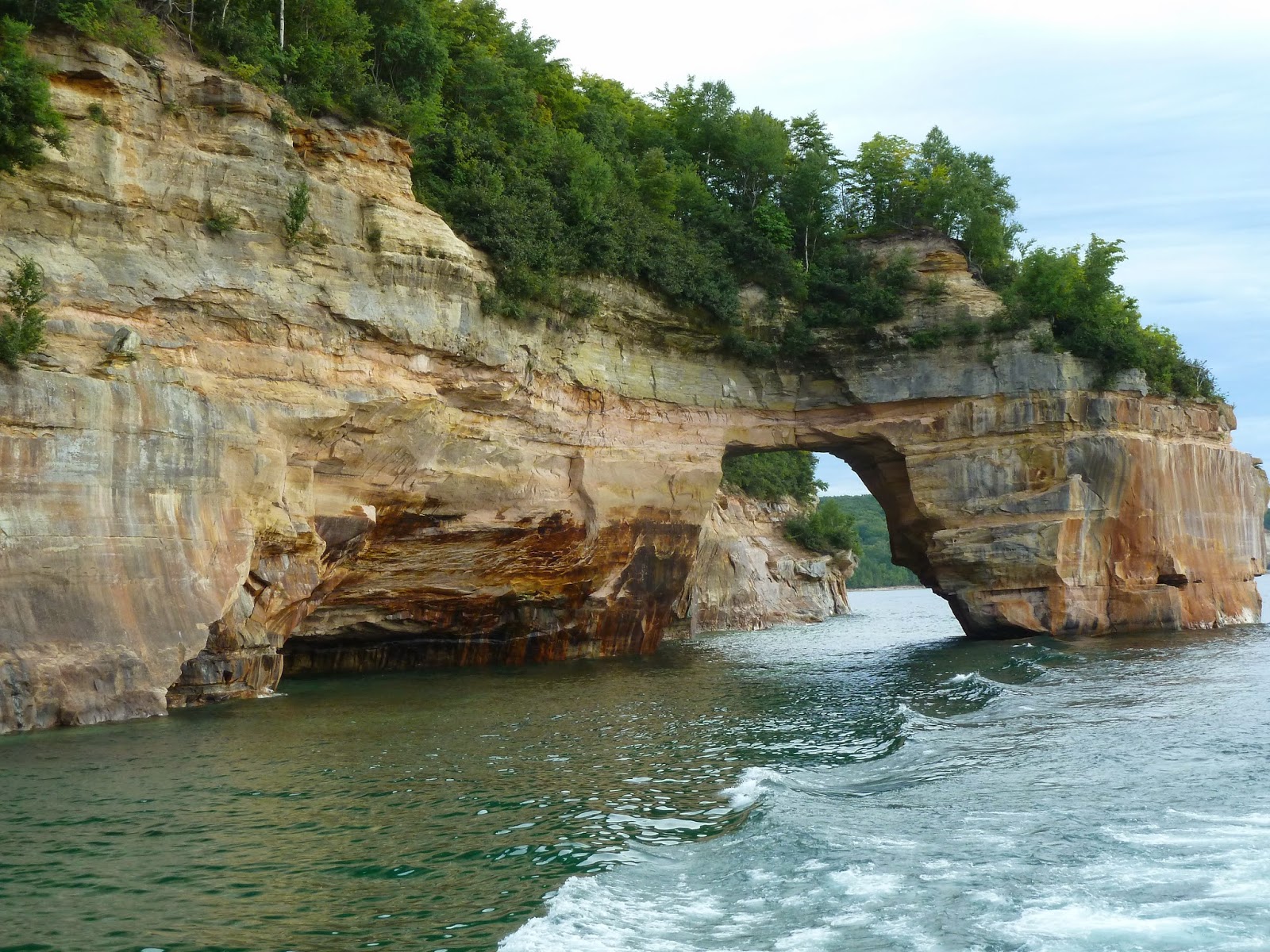 Our first stop was the Pictured Rocks National Lakeshore. This fifty mile stretch along Lake Superior features huge dunes and beautiful waterfalls, but the stars are the rock formations themselves. From the National Park Service, “the Pictured Rocks are sandstone cliffs rising 50 to 200 feet directly up from Lake Superior. Mineral seepage creates the colors.” Ironically, you can only see them from the water, so we joined 150 of our closest friends for a truly beautiful sunset cruise. The fierce winds and dangerous waves on Lake Superior are legendary, but this evening it was 70 degrees, and the water was like silk.