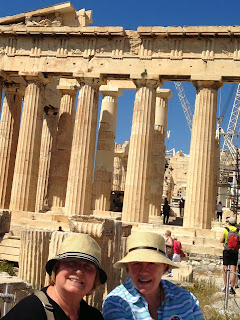 We had rejected a tour that would require us to climb to the top – nope, too strenuous. So we used the Hop On Hop Off bus to take us just to see the Acropolis, but once off the bus, we looked at each other, with challenge in our eyes, and began the hike. The physicality of climbing over the slippery, uneven marble steps to the top was a victory for me, even though we felt aided by the movement of the groups of ten year old students we’d wedge ourselves between.  They were well behaved, but they were ten, and you had to go with the flow which was up and over, and up and over until we reached the vista that granted a grand view of the city.