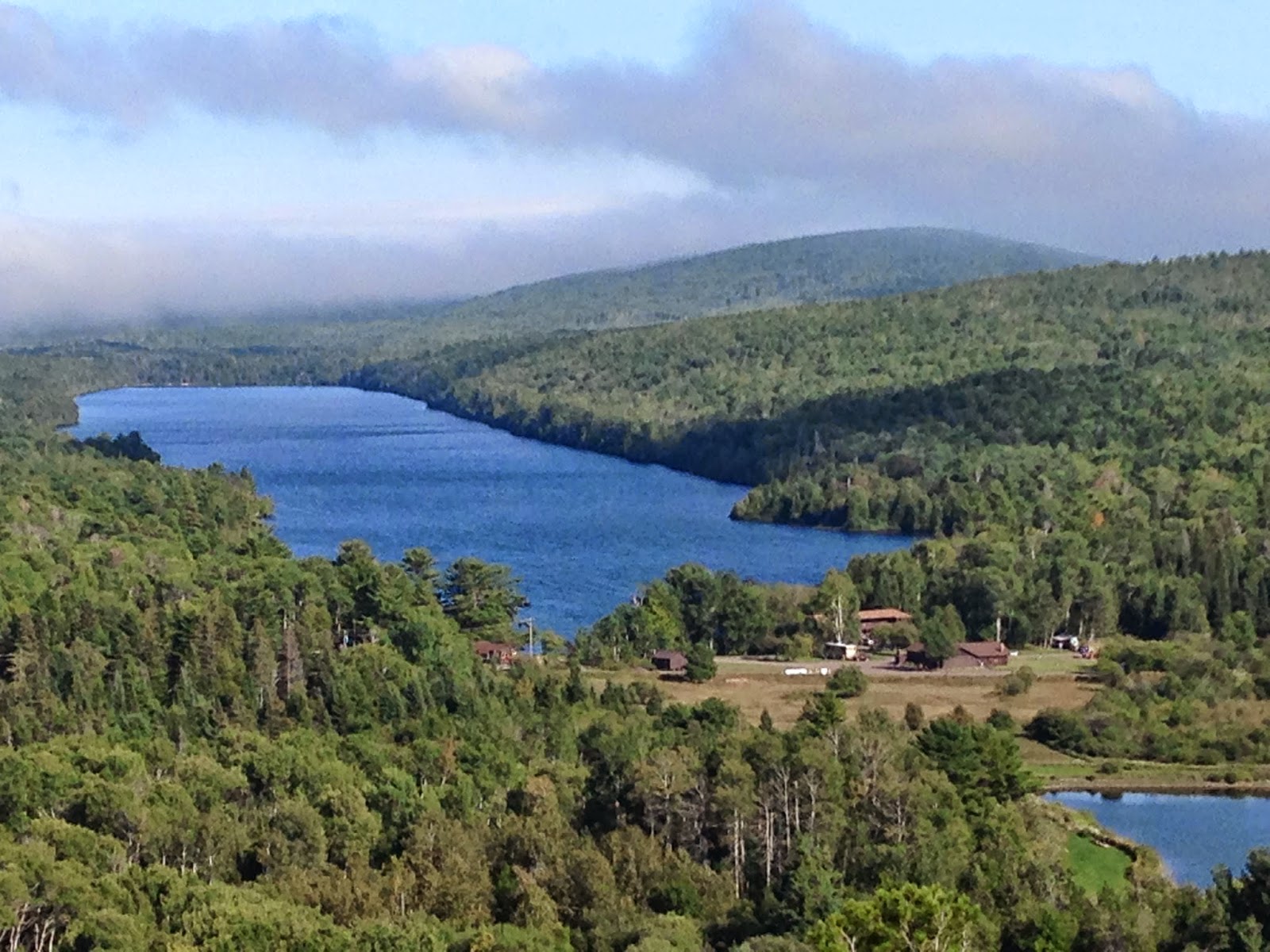 Taking advantage of the beautiful day, we drove up Brockway Mountain, “paved in potholes”, we’d been warned. Standing 1300 feet above sea level, from the heavens to the earth, it was a visual buffet, and can’t be captured by pictures. To our left was the vast expanse of Lake Superior with small islands serving as natural breakwaters, shrouded in wisps of fog; in front and to the right, greens of every hue sprinkled with flecks of gold and orange, broken up by inland lakes. The small village of Copper Harbor hugs the shoreline. The scene was every bit as beautiful as anything I’ve ever seen.